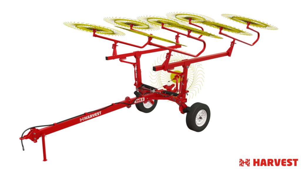 Скоростные колесно-пальцевые грабли HARVEST- SWR 9 (ГКП 5,4 М - 2ГЦ) предназначены для сгребания провяленной травы из прокоса в валки, ворошения ее в прокосах и оборачивания валков.