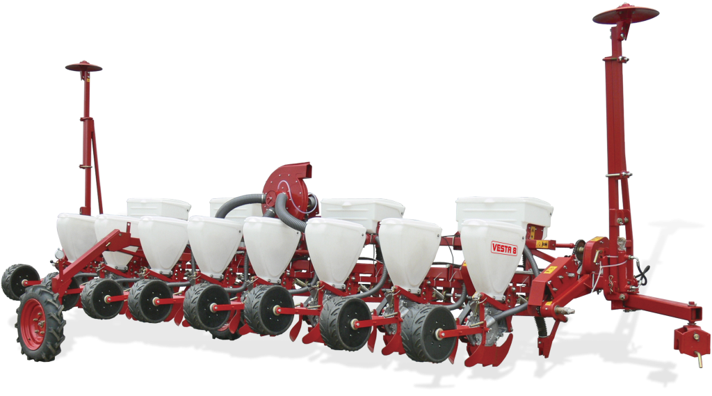 Универсальная пневматическая сеялка VESTA 8 - предназначенная для точного посева калиброванных, дражированных и обычных семян сахарной и кормовой свеклы, сои, кукурузы, подсолнечника, клещевины, сорго, кормовых бобов, фасоли и других семян, близких к ним по размерам с одновременным, раздельным от семян внесением гранулированных минеральных удобрений и прикатыванием почвы в рядках.